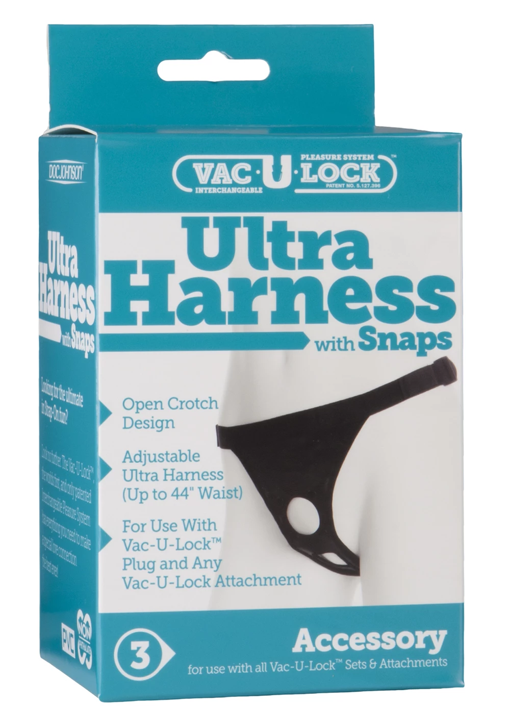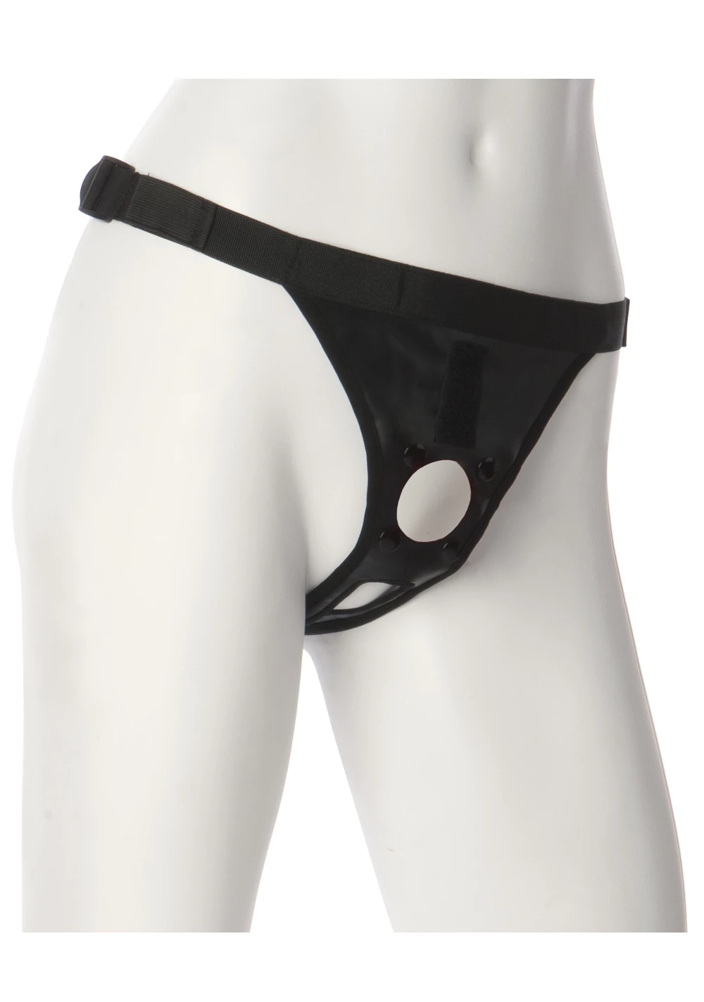 Introducing Doc Johnson’s Ultra Harness II. This harness has an adjustable waist up to 53 inches, an open crotch for maximum comfort, easy access, and non-slip action; all designed to give you command and control for your erotic pleasures. This Harness can be used by women or men. The opening under the plug is high enough to allow the man’s penis to hang below. Just add your favorite Doc Johnson Vac-U-Lock attachment and you’re ready to go! Available with snaps.