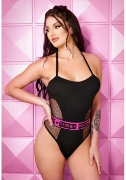 Cheeky Microfiber and Fishnet Playsuit with “Pussy Power” Elastic Waistband.