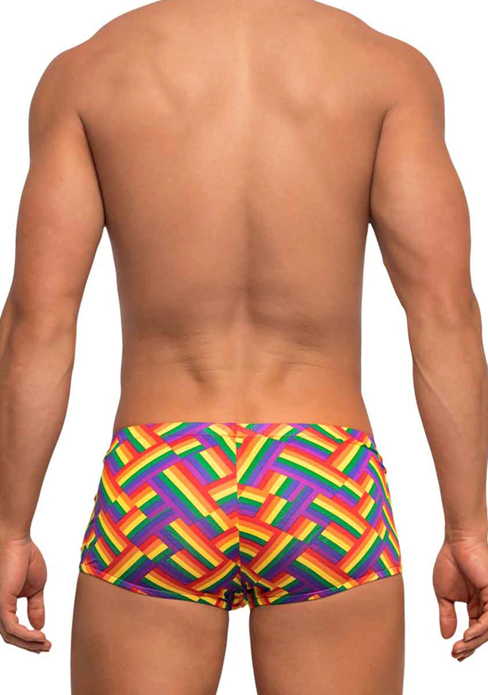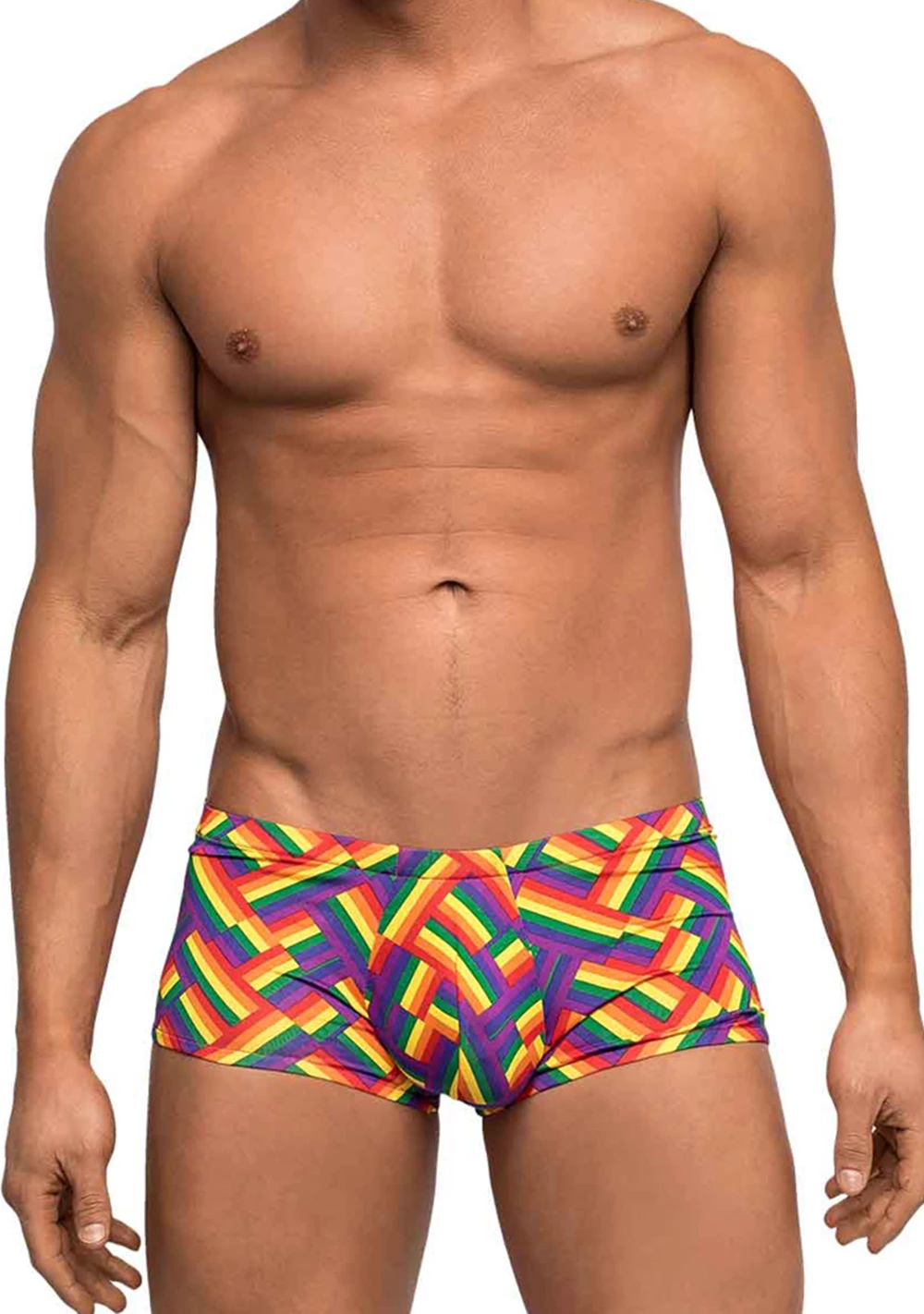 From the Pride Fest collection by Male Power, this style features a mini short with a low rise waist and high-cut legs featuring our contoured comfort pouch and full rear coverage.