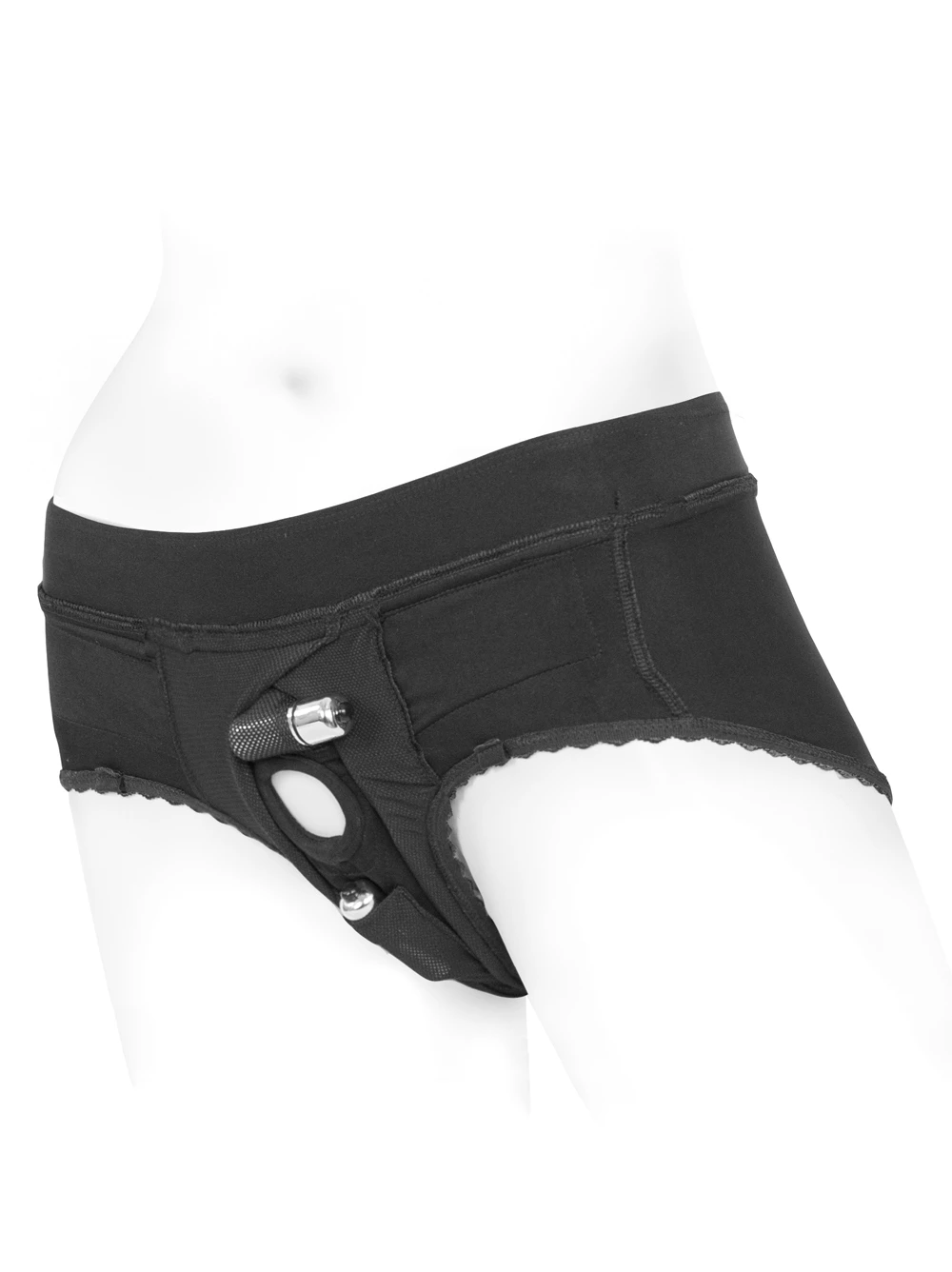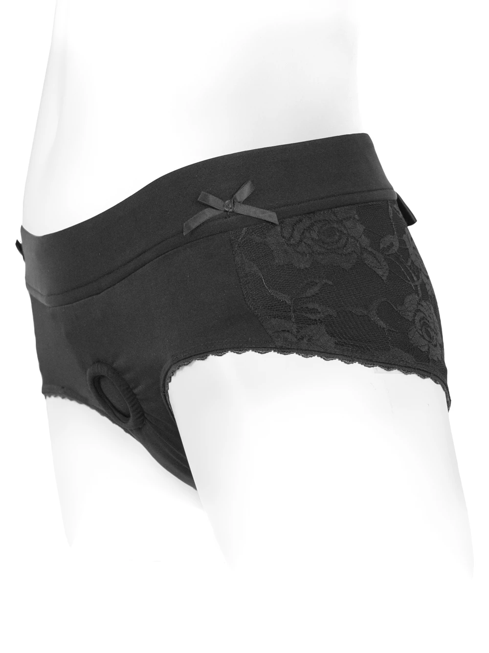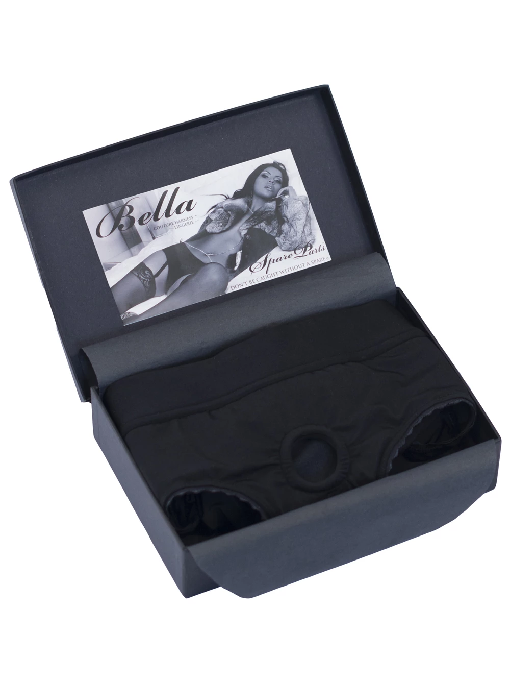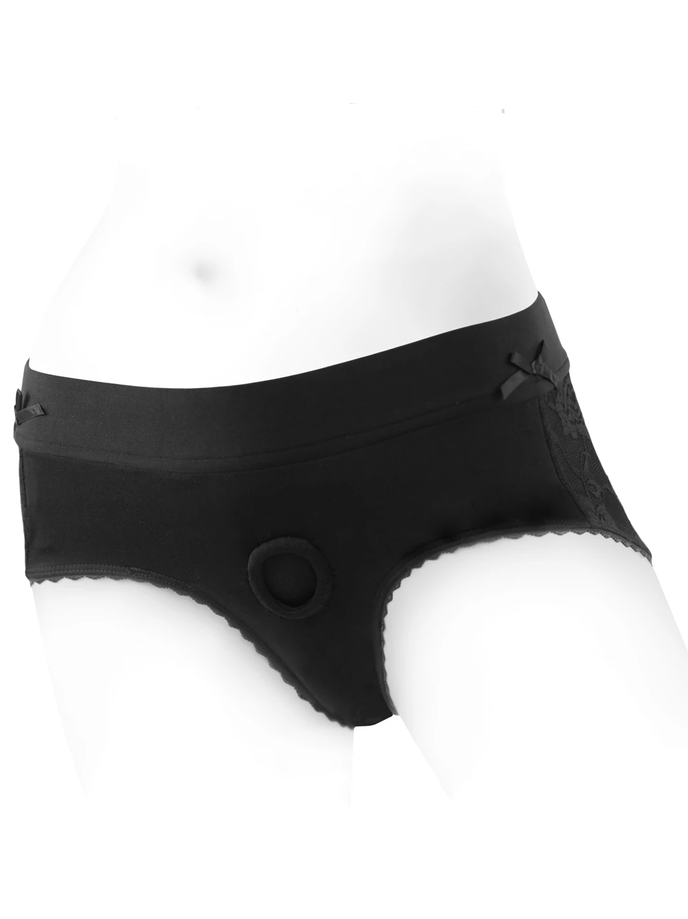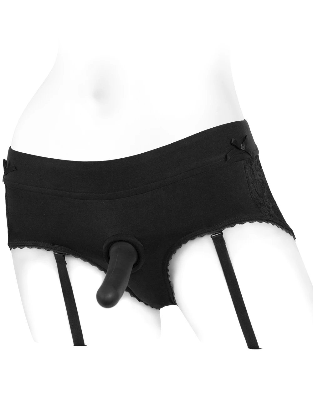 Harness the perfect femme-tastic lingerie look and support your strap-on dildo in high style with the super-sexy Bella. Cut like booty shorts and crafted from gorgeous stretch black lace over black nylon spandex, a strong and stretchy material that holds its shape, it also rocks four black removable garters (included) and a beautiful bow over rear peephole cleavage. Sturdy yet flexible elastic flatters your hips for a smooth, streamlined look. Comfy, functional, and easy-on/easy off, this is one harness you can wear all day – the material wicks moisture away from the body and keeps you cool when things get hot, plus quick-dry nylon spandex is ideal for wet play—it’s 100% water-friendly and, of course, washable. Durable elastic O-ring fits toys 1 ¼” to2 ¼” in diameter; two internal fabric panels separate the wearer’s dildo from their skin, if desired, or shift out of the way to accommodate a double dildo. With two internal mini-vibe pockets (vibes not included), positioned to pleasure both partners. Dress for ecstasy!