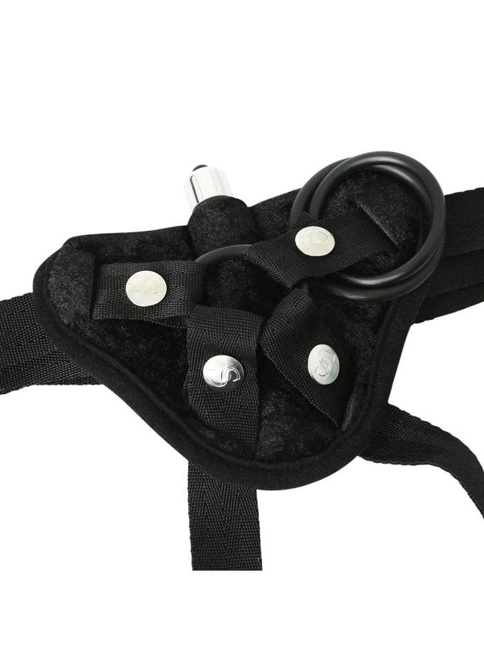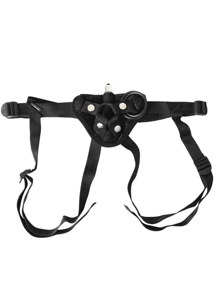 This unique, versatile and economical harness is an excellent choice, particularly for first-timers or those looking for a vibrating harness. The padded, soft velvet-like triangle provides extra cushioning, a secure base for your strap-on toy and a hidden pocket that holds a mini-bullet vibe (included, with batteries). To add stimulation for the wearer, try wearing the We-Vibe under this harness. Fully adjustable nylon straps (one loops around the waist, the other two fit around each leg) fit a wide range of sizes (up to 60ā hips). Includes three interchangeable nitrile O-rings (1.5ā, 1.75ā and 2ā) to accommodate a range of dildo sizes. The harness is machine washable.